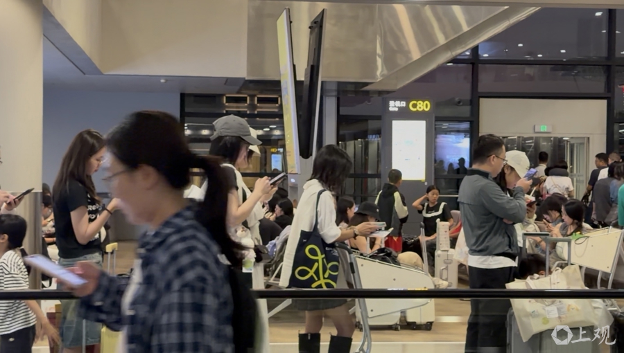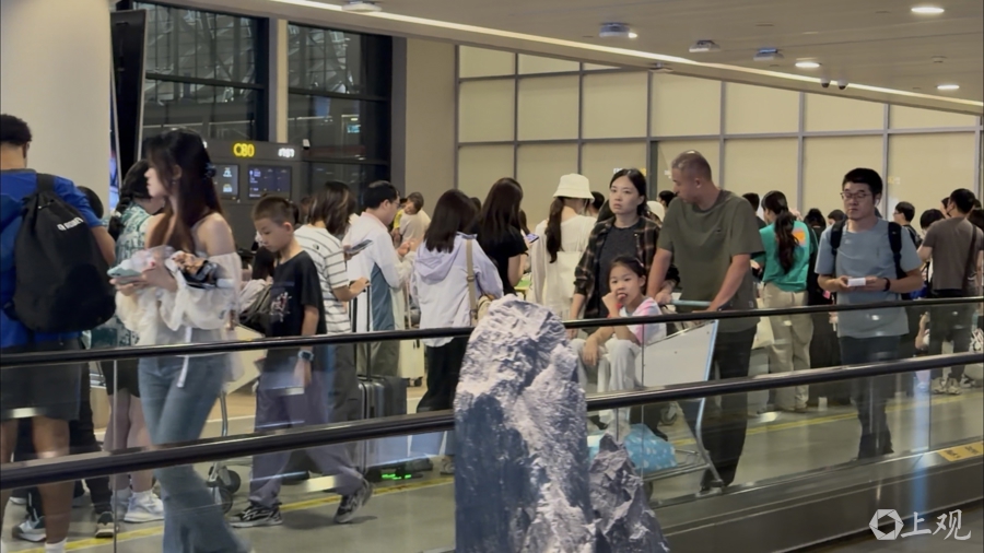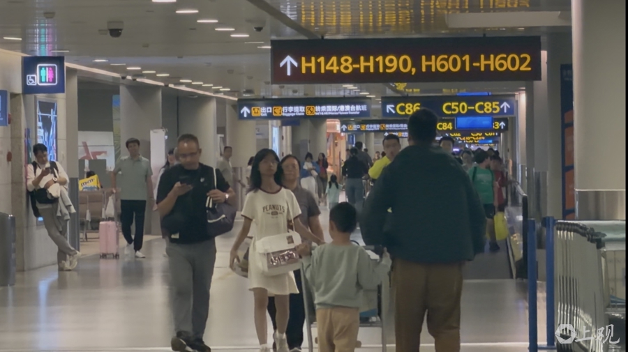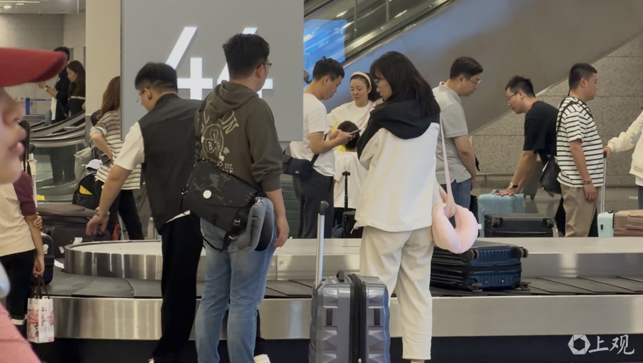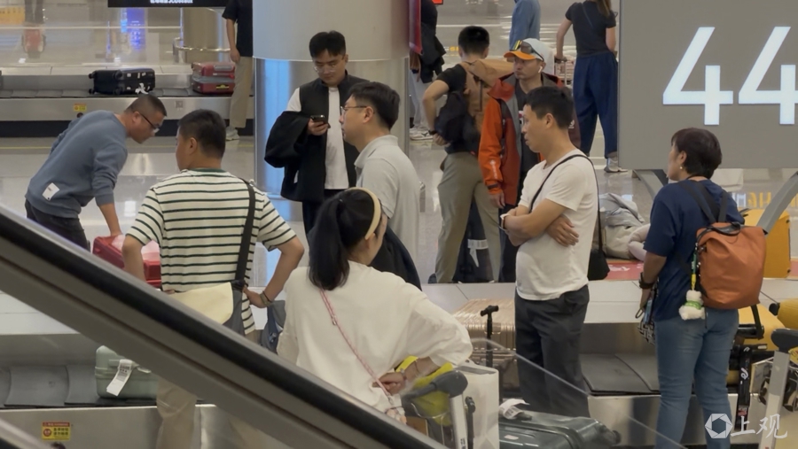 2025年10月7日晚上11点半,浦东机场航站楼到达区域热闹非凡,返沪旅客等候领取行李;在出租车候车区,现场备车充足,仅需5分钟就能打到车。